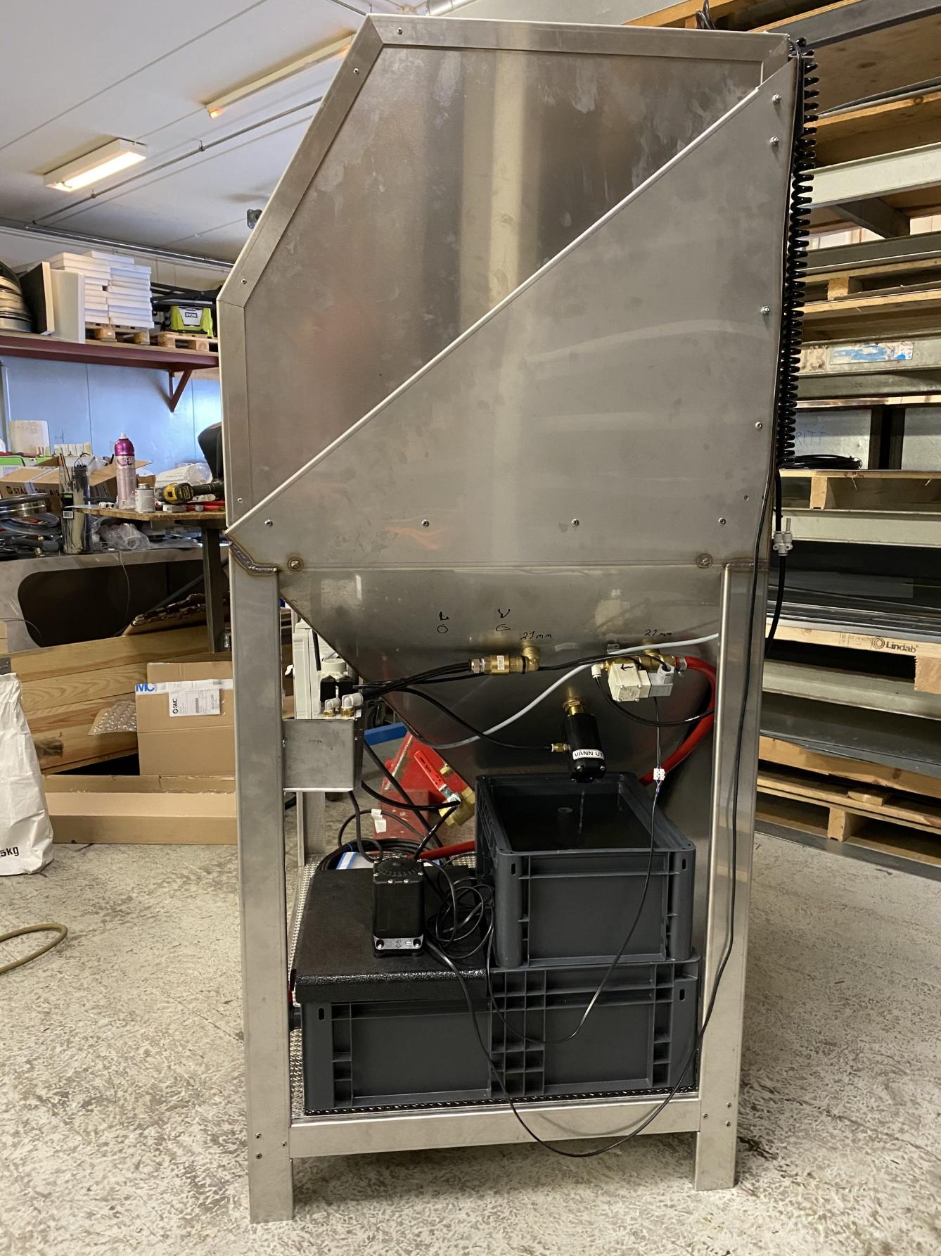 Maskinen er enkel å betjene, med tydelige koblinger og ryddig kabinett. Brukeren har god oversikt over pumpe, slanger, filter og vannivå, noe som gir trygg og effektiv drift i det daglige.