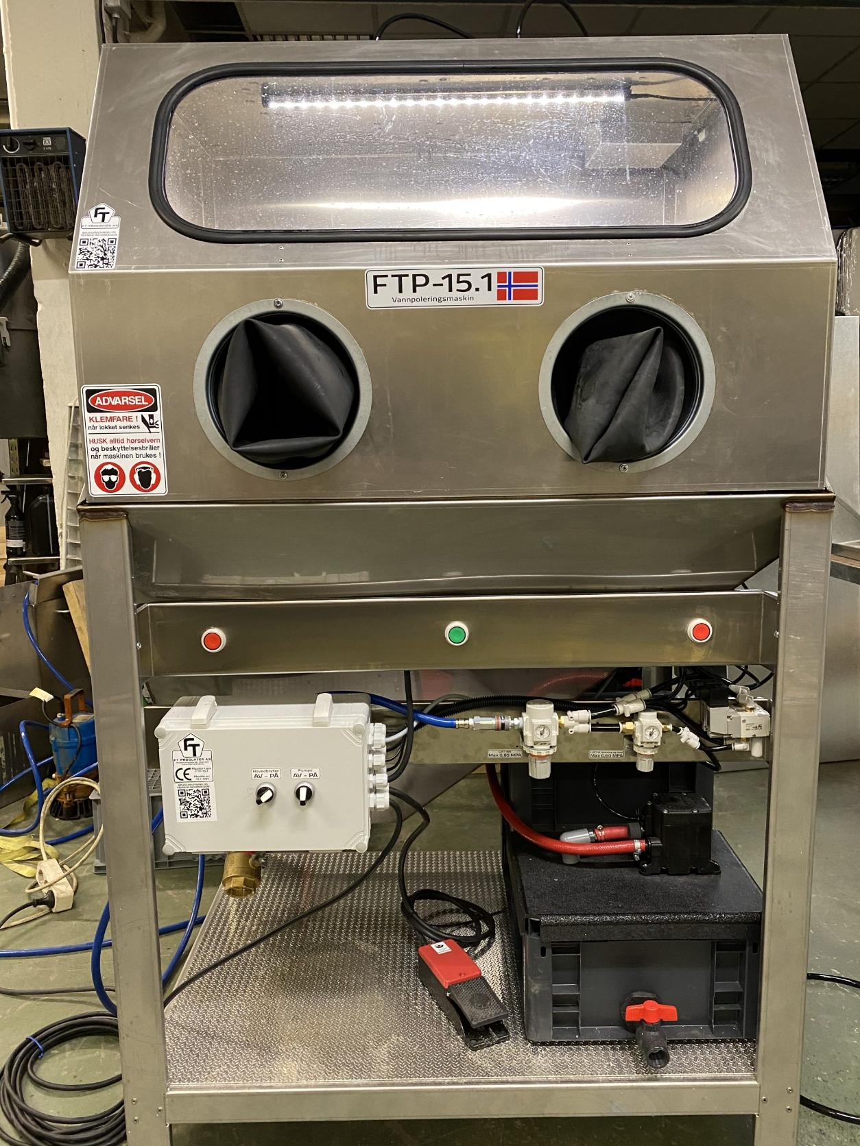 FTP 15 er produsert og sammensatt på Holmlia i Oslo. Maskinen er bygget i rustfritt stål, mens lokket er laget i aluminium og åpnes vertikalt. Dette gir et kabinett som står stødig, tar mindre plass og ikke har utstikkende deler som kan skades ved daglig bruk. Maskinen er CE-godkjent og utviklet for norske og europeiske verksteder.